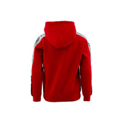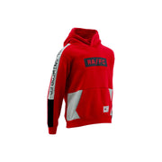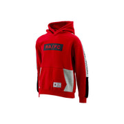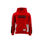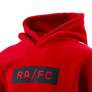 Kleurrijke hoodie met kap voor kinderen. Rood met grijze en donkere accenten, RA/FC op de voorzijde en Royal Antwerp FC op de mouwen.