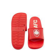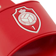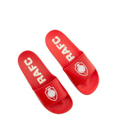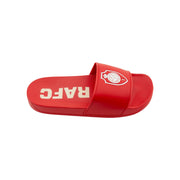 Rode badslippers met het logo in reliëf en RAFC op de voetzool.